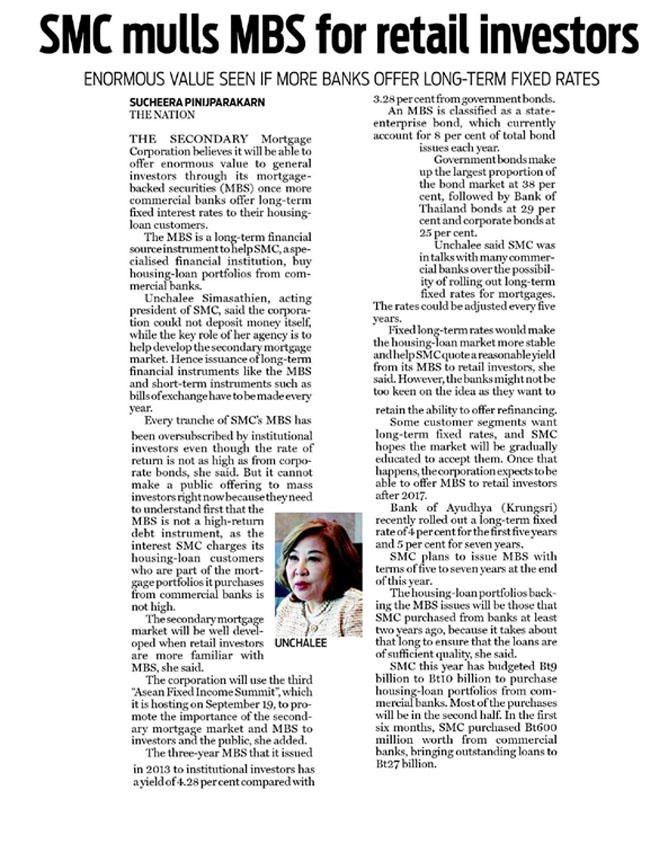 Asean Fixed Income Summit, which it is hostingon September 19, to promote the importance of the secondy mortgage market and MBS to investors and the public said by khun Unchalee.